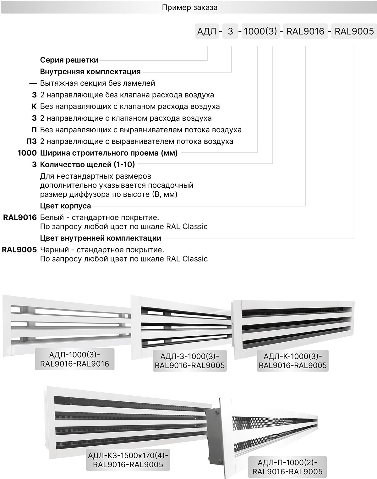 Щелевые решетки АДЛ-З изготавливаются из экструдированного алюминиевого профиля АД31 по ГОСТ 22233-2001. По умолчанию корпус диффузоров окрашивается в стандартный белый цвет RAL 9016. По индивидуальному заказу возможна окраска в любой цвет по шкале RAL.